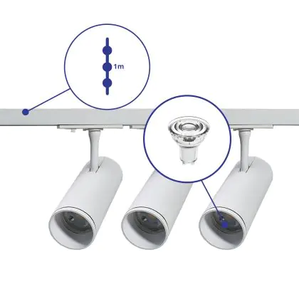 Descrizione Bright Choice Set completo 1-Fase Rail 1 Metro Bianca | incl. 3x Faretti + GU10 2700K 3W Dimmerabile + Tappo Di Chiusura, Connettore di Alimentazione