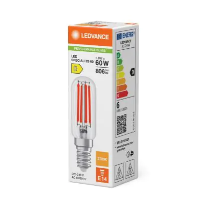 La lampada Ledvance LED Speciale E14 Filamento Chiara 5.9W 806lm - 827 Bianco Molto Caldo | Sostitutiva 60W è il sostituto perfetto per le tue vecchie lampade 60W con attacco a vite piccolo E14 grazie alla sua tecnologia LED. Passare a LED ti offrirà molti vantaggi!