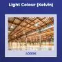 Puoi anche scegliere l'apparecchio in base all'angolo del fascio di luce, che in questo caso è di 120°. Un altro modo per scegliere una lampada industriale è attraverso la temperatura di colore della luce che emette. Per questo apparecchio è 4000K - Bianco Freddo. Generalmente, meno luce naturale c'è in una stanza, più freddo è il colore della luce artificiale che si sceglie. Per sapere come orientarsi fra le varie temperature di colore della luce, si possono usare queste linee guida: