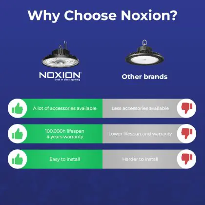 Questa lampada industriale LED di Noxion, anche chiamata high-bay, è la soluzione di illuminazione ideale per spazi con soffitti di più di 4 metri perché ha una forte emissione luminosa. Come suggerisce il nome, questa lampada è stata progettata per uso industriale, in fabbriche e magazzini. A seconda della resistenza all'acqua e agli urti, questo apparecchio LED può essere usato sia all'interno che all'esterno. Questa lampada industriale ha protezione contro l'ingresso di solidi e liquidi di  e protezione contro gli urti pari a