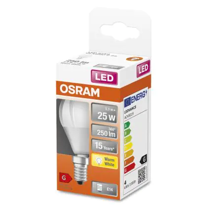 La lampada Osram LED Star Classic E14 Sferica Ghiaccio 3.3W 250lm - 827 Bianco Molto Caldo | Sostitutiva 25W è il sostituto perfetto per le tue vecchie lampade 25W con attacco a vite piccolo E14 grazie alla sua tecnologia LED. Passare a LED ti offrirà molti vantaggi!